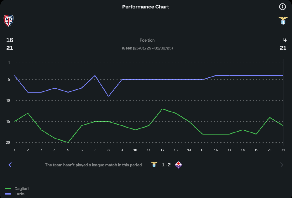 ย้อนกลับไปดูการพบกัน 10 นัดหลังสุด ลาซิโอ แสดงให้เห็นถึงความเหนือกว่าชัดเจน โดยเก็บชัยชนะได้ถึง 8 นัด เสมอ 1 และแพ้เพียงแค่ 1 นัดเท่านั้น ที่น่าสนใจคือใน 4 นัดหลังสุด ลาซิโอเอาชนะกาญารี่ได้ทั้งหมด โดยยิงรวมถึง 9 ประตู ถือเป็น ทีเด็ดบอล สำคัญที่ลาซิโอมีเหนือกาญารี่เสมอ เกมนี้กาญารี่จึงต้องพยายามอย่างหนักหากหวังจะหยุดสถิติที่น่าผิดหวังนี้ได้