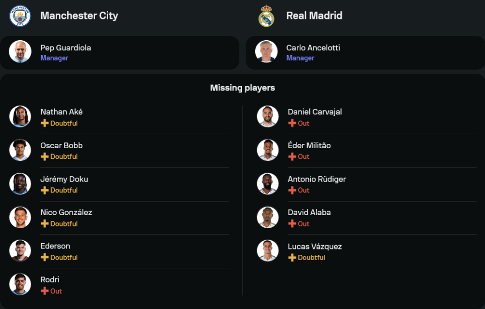 ทีมของ คาร์โล อันเชล็อตติ ยังคงขาดกองหลังตัวหลักหลายคน ทั้ง เอแดร์ มิลิเตา, ดานี่ คาร์บาฆาล, อันโตนิโอ รูดิเกอร์ และ ดาวิด อลาบา ที่ยังบาดเจ็บ แต่เกมรุกยังอันตรายสุดขีด เมื่อมี คิเลียน เอ็มบัปเป้ เป็นหน้าเป้า โดยมี จู๊ด เบลลิ่งแฮม, โรดริโก้ และ วินิซิอุส จูเนียร์ เป็นตัวสนับสนุน