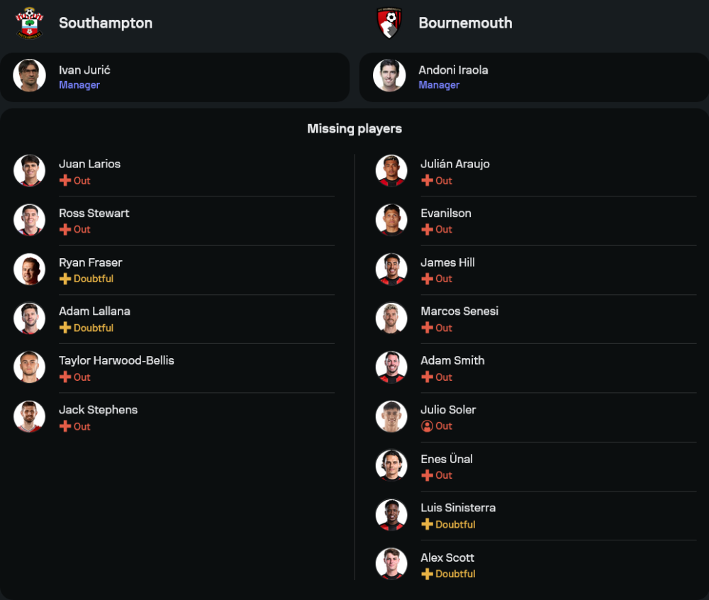 “นักบุญ” ของ อิวาน ยูริช เพิ่งพ่าย เบิร์นลี่ย์ 0-1 ในเกม เอฟเอ คัพ ส่งผลให้ขวัญกำลังใจของทีมยังไม่ดีขึ้น สำหรับสภาพความพร้อมก่อนเกม พวกเขายังต้องขาด รอสส์ สจ๊วร์ต และ แจ็ค สตีเฟ่นส์ ที่ยังไม่ฟื้นตัวจากอาการบาดเจ็บ อย่างไรก็ตาม แนวรุกยังนำโดย ปอล โอนูอาชู ที่จะเป็นตัวความหวังในการทำประตู ร่วมกับ อัลเบิร์ต กรอนเบค และ มาเตอุส แฟร์นานเดส ที่จะคอยสนับสนุนอยู่ด้านหลังในระบบ 3-4-2-1