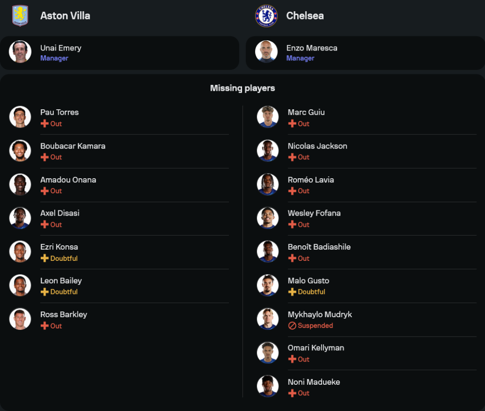 ทีมเยือนของ เอนโซ่ มาเรสก้า กำลังเจอปัญหาหนักกับฟอร์มที่ตกลงไปอย่างน่าใจหาย โดยเฉพาะเกมล่าสุดที่พ่าย ไบรท์ตัน 0-3 และแพ้มา 3 จาก 4 นัดหลังสุด พวกเขาจะไม่มี โนนี่ มาดูเอเก้, มาร์ก กียู, โรเมโอ ลาเวีย, โอมารี่ เคลลี่แมน, เวสลี่ย์ โฟฟาน่า และ เบอนัวต์ บาเดียชิล ที่ยังไม่หายเจ็บ รวมถึง มีไคโล มูดริค ที่ติดโทษแบน อย่างไรก็ตาม เชลซียังมีแนวรุกอย่าง โคล พาลเมอร์, คริสโตเฟอร์ เอ็นกุนกู และ เจดอน ซานโช่ ที่พร้อมลงสนาม