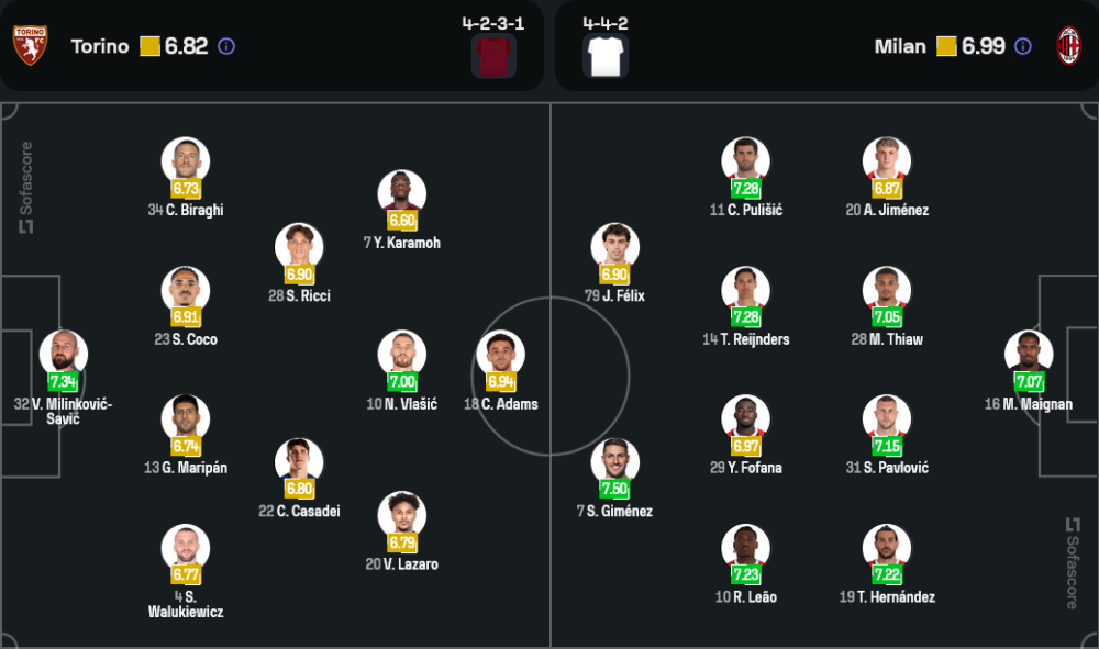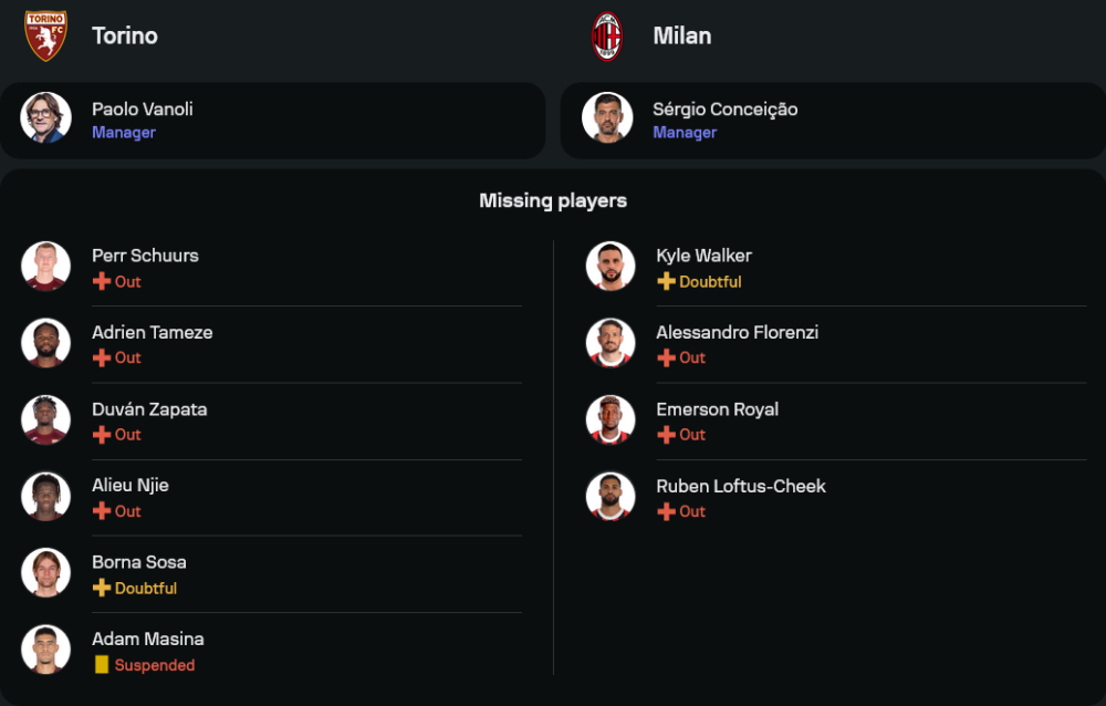 ฝั่ง “ปีศาจแดงดำ” ของ แซร์โจ้ คอนไซเซา แม้จะมีปัญหาผู้เล่นเจ็บอยู่บ้าง แต่ขุมกำลังก็ยังแข็งแกร่ง โดยพวกเขาจะขาด อเลสซานโดร ฟลอเรนซี, เอเมอร์สัน รอยัล และ รูเบน ลอฟตัส-ชีค ที่ยังมีอาการบาดเจ็บ ส่วน ไคล์ วอล์คเกอร์ ยังต้องรอเช็คความฟิตก่อนเกม แต่ข่าวดีคือพวกเขาได้ ฟิกาโย โทโมรี กลับมาจากโทษแบน คาดว่าเกมนี้ มิลาน จะมาในระบบ 4-4-2 โดยมี ราฟาเอล เลเอา และ ซานติอาโก้ ฆิเมเนซ เป็นคู่กองหน้าล่าตาข่าย
