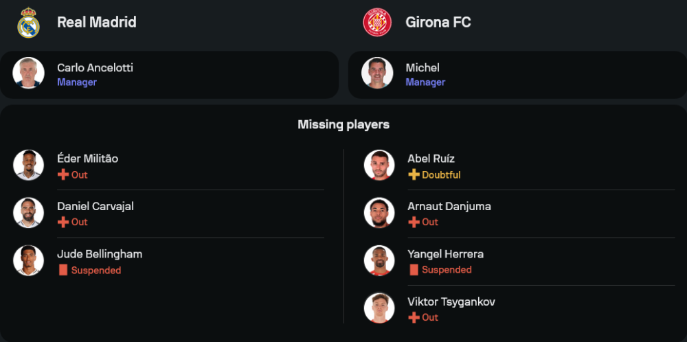 ลูกทีมของ คาร์โล อันเชล็อตติ กำลังมั่นใจสุดขีดหลังเพิ่งเปิดบ้านอัด แมนเชสเตอร์ ซิตี้ 3-1 ในศึกแชมเปี้ยนส์ลีก แต่ข่าวร้ายคือพวกเขาจะไม่มี เอแดร์ มิลิเตา และ ดานี่ การ์บาฆาล ที่ยังบาดเจ็บ รวมถึง จู๊ด เบลลิ่งแฮม เพลย์เมกเกอร์ตัวเก่งที่ติดโทษแบน อย่างไรก็ตาม ทีมยังมีแนวรุกสุดโหดอย่าง คิเลียน เอ็มบัปเป้, วินิซิอุส จูเนียร์ และ โรดริโก้ คาดว่าจะมาในระบบ 4-3-3 โดยให้ เอดูอาร์โด้ คามาวิงก้า ขยับขึ้นมาเล่นบทบาทกองกลางตัวรุกแทนเบลลิ่งแฮม