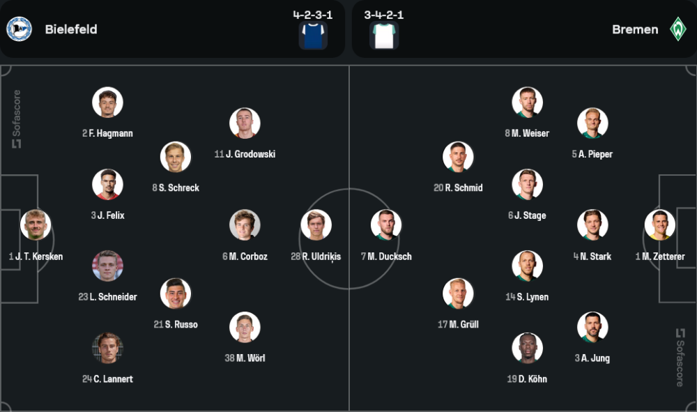 บีเลเฟลด์ ภายใต้การคุมทีมของ มิเชล คนิตต์ โชว์ฟอร์มได้ร้อนแรงในรายการนี้ ด้วยการปราบทีมจากลีกสูงกว่าอย่าง ไฟร์บวร์ก และ ยูนิโอน เบอร์ลิน มาแล้วในรอบที่ผ่านมา ที่สำคัญคือ ไม่มีนักเตะบาดเจ็บหรือติดโทษแบน แถมยังมีขุมกำลังที่พร้อมลุยเต็มที่ โดยเกมนี้จะวาง ยูเลี่ยน คาเนีย และ ลูคัส คุนซ์ เป็นตัวทีเด็ดในแดนหน้า พร้อมกับให้ คริสโตเฟอร์ แลนเนิร์ต และ หลุยส์ ออฟพี ทำเกมริมเส้นเพื่อสนับสนุนเกมรุก