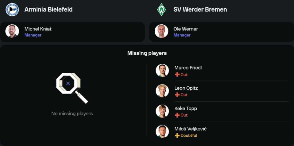 ทีมเยือน แวร์เดอร์ เบรเมน ของ โอเล่ แวร์เนอร์ อยู่ในช่วงฟอร์มตกแบบสุดๆ หลังจากพ่ายแพ้มา 3 เกมติดต่อกัน และเสียประตูรวมถึง 11 ลูก ขณะที่ขุมกำลังก็ไม่สมบูรณ์ เนื่องจาก มาร์โค ฟรีเดิล, ลีออน โอปิทซ์ และ เคเก้ ท็อป มีอาการบาดเจ็บ ขณะที่ มิลอส เวลจ์โควิช ยังต้องรอเช็กความฟิต อย่างไรก็ตาม ทีมยังพอมีทีเด็ดจากแนวรุกอย่าง มาร์วิน ดุ๊คช์ และ อังเดร ซิลวา ที่จะเป็นตัวความหวังในการเจาะแนวรับคู่แข่ง