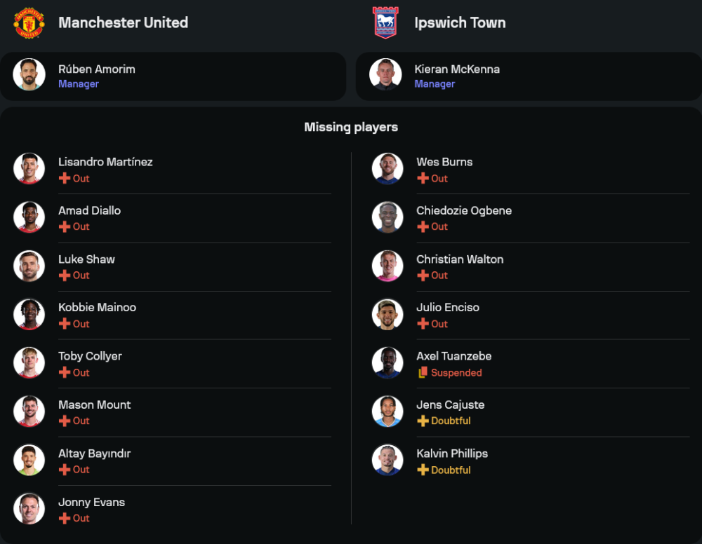ลูกทีมของ รูเบน อาโมริม กำลังเผชิญปัญหาเรื่องขุมกำลัง หลังมีผู้เล่นบาดเจ็บเพียบ ทั้ง ลิซานโดร มาร์ติเนซ, อาหมัด ดิยัลโล่, ลุค ชอว์, ค็อบบี้ ไมนู, โทบี้ คอลเลอร์, เมสัน เมาท์, อัลตาย บายินดีร์ และ จอนนี่ อีแวนส์ ที่ยังไม่สามารถลงสนามได้