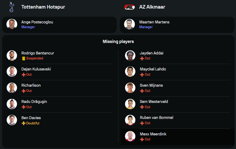 ทีมของ อังเก้ ปอสเตโคกลู เพิ่งเสมอกับ บอร์นมัธ 2-2 ในเกมลีกล่าสุด และต้องกลับมาลุยต่อในเกมยุโรปอย่างไม่ให้เสียจังหวะ อย่างไรก็ตาม เกมนี้พวกเขาต้องขาด โรดริโก้ เบนตานกูร์ ที่ติดโทษแบน ขณะที่ ริชาร์ลิซอน, เดยาน คูลูเซฟสกี้, ราดู ดรากูซิน และ เบน เดวีส์ ยังไม่พร้อมลงสนาม คาดว่าทีมจะมาในระบบ 4-3-3 โดยฝากความหวังในแนวรุกไว้ที่ ซอน ฮึง-มิน, โดมินิก โซลันเก้ และ เบรนแน่น จอห์นสัน