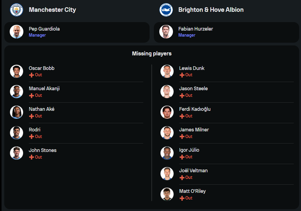 เป๊ป กวาร์ดิโอล่า ยังต้องปวดหัวกับปัญหาผู้เล่นบาดเจ็บหลายราย โดย โรดรี้, มานูเอล อาคานยี่, จอห์น สโตนส์ และ นาธาน อาเก้ ยังคงชวดช่วยทีมทั้งหมด ขณะที่ เออร์ลิ่ง ฮาลันด์ พร้อมลงล่าตาข่ายเช่นเคย และมี เควิน เดอ บรอยน์ เป็นตัวปั้นเกม