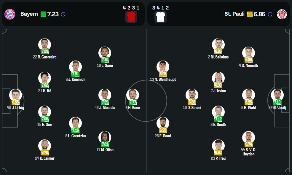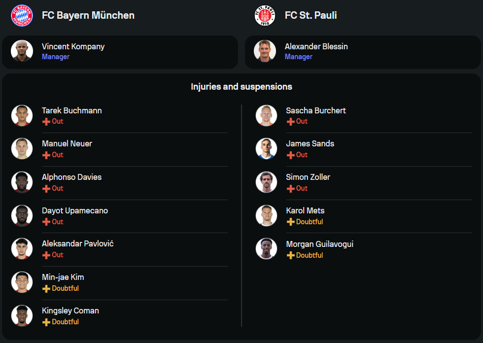บาเยิร์น มิวนิค ของกุนซือ แว็งซ็องต์ ก็อมปานี แม้ยังยืนหยัดนำจ่าฝูง แต่ก็เจอปัญหานักเตะบาดเจ็บเล่นงานหลายตำแหน่ง โดยเฉพาะแนวรับที่ ดาโยต์ อูปาเมกาโน่, อัลฟอนโซ่ เดวีส์, อเล็กซานดาร์ พาฟโลวิช และ มานูเอล นอยเออร์ ยังไม่สามารถกลับมาช่วยทีมได้ ทำให้แนวรับต้องพึ่งพา เอริค ดายเออร์, ฮิโรกิ อิโตะ และ ราฟาเอล เกร์เรโร่ ลงสนามพร้อมกันเป็นครั้งแรก ขณะที่แนวรุกยังคงเป็นจุดแข็ง โดยมี แฮร์รี่ เคน เป็นตัวทีเด็ดในการจบสกอร์ ร่วมกับ เลรอย ซาเน่, จามาล มูเซียล่า และ ไมเคิ่ล โอลิเซ่ พร้อมเดินหน้าล่าตาข่าย