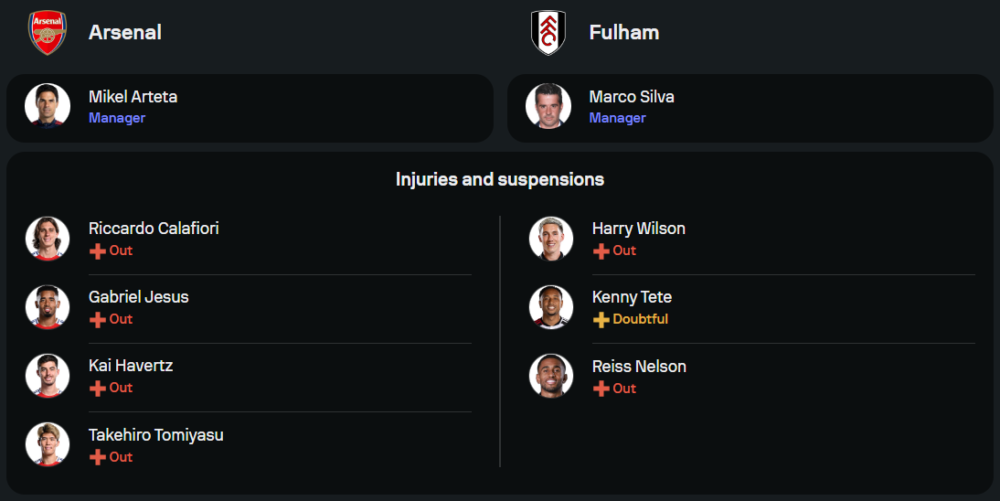 ฝั่งทีมเยือนของ มาร์โก ซิลวา ก็เจ็บไม่น้อยหน้า โดยต้องขาดแนวรุกตัวสำคัญอย่าง แฮร์รี่ วิลสัน และ ไรส์ เนลสัน ขณะที่ เคนนี่ เตเต้ ต้องรอเช็กฟิตอีกครั้ง เกมนี้น่าจะใช้บริการของ ราอูล ฆิมิเนซ ยืนหน้าเป้า พร้อมด้วยแนวรุกอย่าง อเล็กซ์ อิโวบี้, สมิธ โรว์ และ อดาม่า ตราโอเร่ คอยทำเกมรุกจากแนวลึก โดยจะมาในระบบ 4-2-3-1 หวังใช้จังหวะโต้กลับที่รวดเร็วเล่นงานเจ้าถิ่น