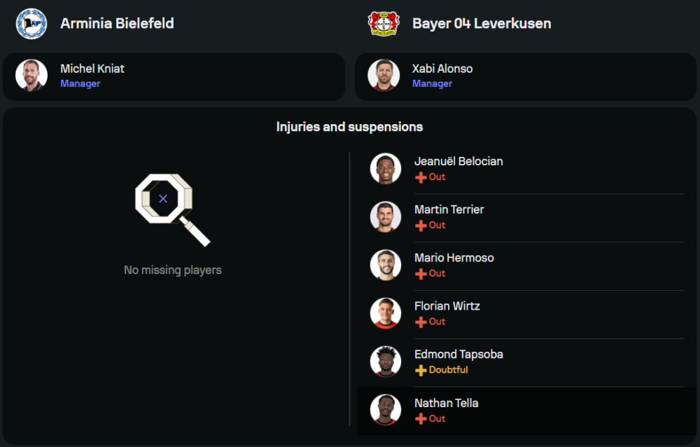 ฝั่งของ ชาบี อลอนโซ่ แม้จะเสียผู้เล่นตัวหลักไปหลายราย อาทิ ฟลอเรียน เวียร์ตซ์, มาริโอ เอร์โมโซ่ และ มาร์ติน แตร์ริเย่ร์ แต่แกนหลักอย่าง ปาทริค ชิค, กรานิต ชาก้า, เยเรมี่ ฟริมปง ยังพร้อมประจำการทั้งหมด เกมนี้คาดว่าจะปรับมาใช้ระบบ 3-4-2-1 โดยส่ง อามีน อัดลี และ อเล็กซ์ การ์เซีย เป็นตัวทำเกมรุกจากแดนสอง และใช้ ชิค ยืนหน้าเป้าไล่ล่าตาข่ายแบบไม่มีปรานี