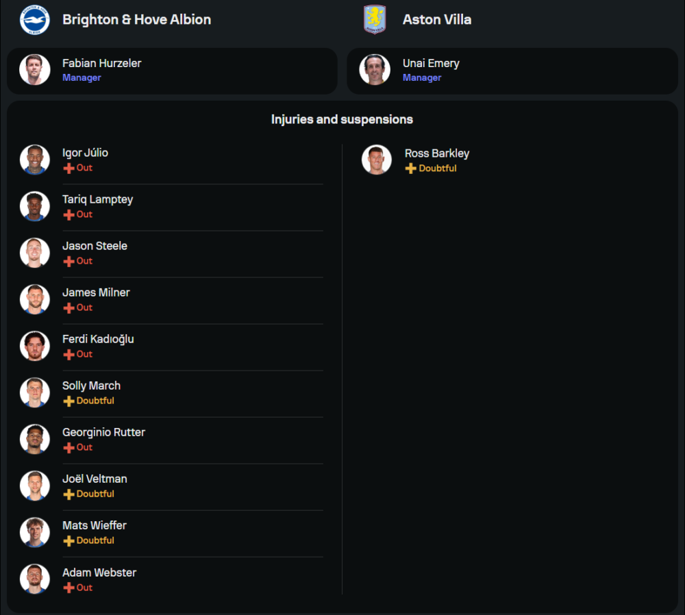 ไบรท์ตัน ของกุนซือไฟแรง ฟาเบียน ฮูร์เซเลอร์ กำลังเจอกับวิกฤตตัวเจ็บเล่นงานอย่างหนัก โดยเฉพาะเกมรับที่ขาดตัวหลักอย่าง อิกอร์ ฮูลิโอ้, โยแอล เฟลต์มัน, อดัม เว็บสเตอร์, รวมถึงขุมกำลังเกมรุกอย่าง จอร์จินิโอ้ รุตเตอร์ และ โซโลม่อน มาร์ช ก็ไม่พร้อมลงสนาม ทำให้ภาระเกมรุกตกอยู่ที่ เชา เปโดร, คาโอรุ มิโตมะ และ ยานกูบา มินเตห์ ส่วนแดนกลางจะใช้ความขยันของ คาร์ลอส บาเลบา กับ ดิเอโก้ โกเมซ เป็นแกนคุมเกม