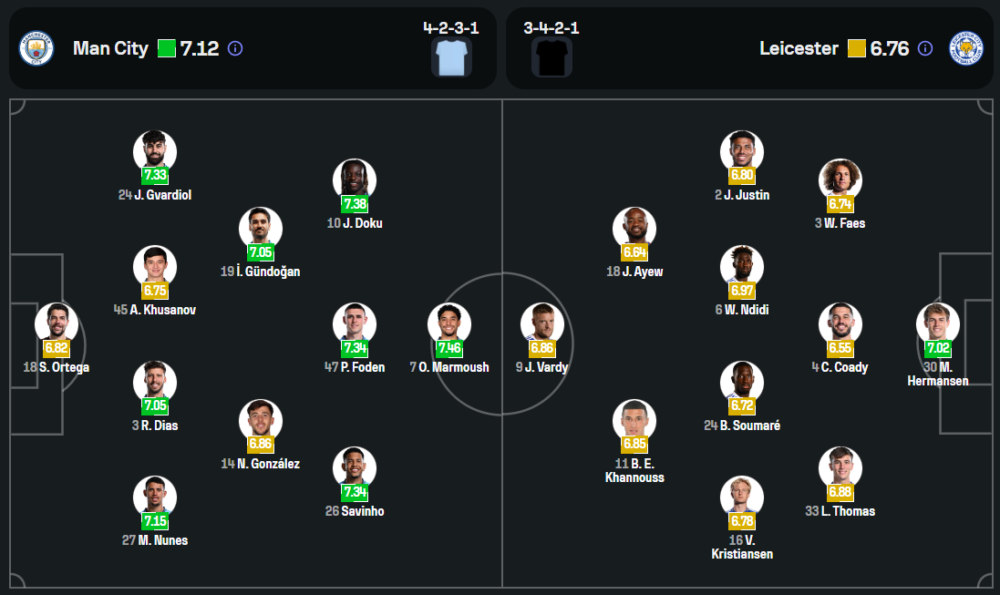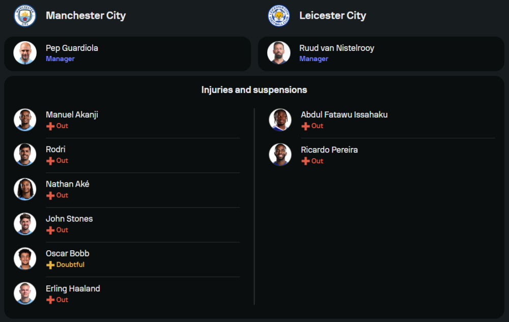 แมนเชสเตอร์ ซิตี้ เป๊ป กวาร์ดิโอล่า ยังคงต้องปวดหัวกับปัญหานักเตะบาดเจ็บหลายราย ไม่ว่าจะเป็น เออร์ลิ่ง ฮาแลนด์, จอห์น สโตนส์, มานูเอล อาคานยี่, นาธาน อาเก้ รวมถึง โรดรี ที่ล้วนแต่มีบทบาทสำคัญในทีมทั้งสิ้น นอกจากนี้ ออสการ์ บ็อบบ์ ยังต้องเช็กฟิตก่อนเกมด้วย โชคดีที่ขุมกำลังหลักรายอื่นยังพร้อมรบเต็มที่ โดยเฉพาะแนวรุกอย่าง ฟิล โฟเด้น, เจเรมี่ โดกู และ โอมาร์ มาร์มูช ที่มีความเร็วและความเด็ดขาดสูง พร้อมลงปั้นเกมล่าตาข่ายแบบจัดเต็มในระบบ 4-2-3-1
