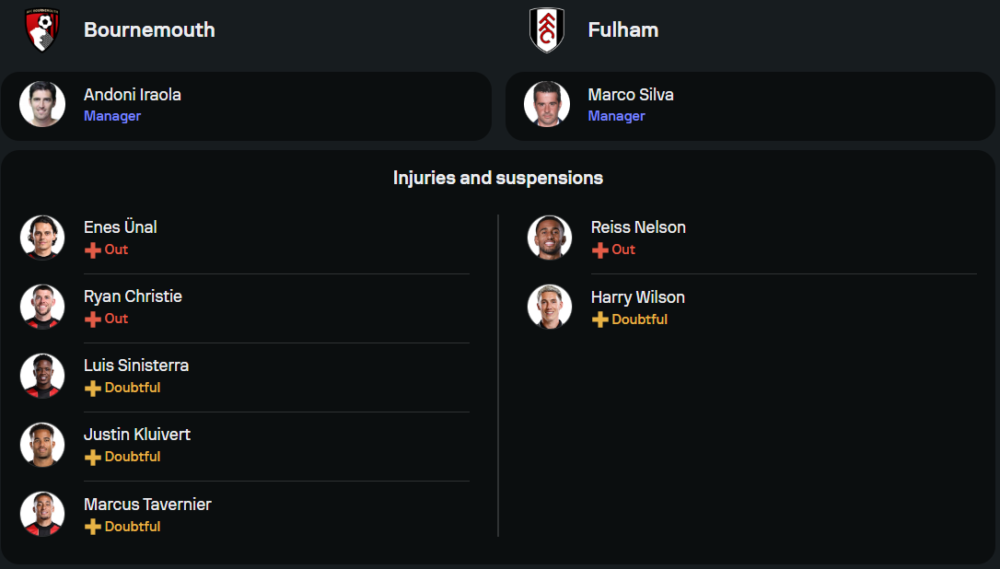 บอร์นมัธ ภายใต้การคุมทีมของ อันโดนี่ อิราโอล่า ยังคงประสบปัญหาตัวผู้เล่นบาดเจ็บหลายรายไม่ว่าจะเป็น มาร์คัส ตาเวอร์เนียร์, เอเนส อูนัล, ไรอัน คริสตี้ และ หลุยส์ ซินิสเตร์ร่า ที่ต่างหมดสิทธิ์ลงสนามในแมตช์นี้ ทำให้ผู้เล่นชุดหลักต้องยืดหยุ่นมากขึ้น เกมนี้คาดว่าจะวางหมากในระบบ 4-2-3-1 โดยมี อีวานิลซอน ยืนหน้าเป้ารอล่าตาข่าย พร้อมสนับสนุนโดยเซ็ตเกมรุกจาก อูอัตตาร่า, เซม็องโย่ และ บรู๊คส์ คอยขับเคลื่อนเกมรุกจากแนวสอง