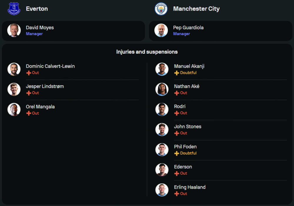 ภายใต้การคุมทัพของ เดวิด มอยส์ ทอฟฟี่สีน้ำเงินกำลังใจมาเต็ม หลังบุกเชือดฟอเรสต์ 1-0 แมตช์ล่าสุด แต่สภาพทีมยังคงขาดกำลังสำคัญอย่าง โดมินิก คัลเวิร์ต-เลวิน, เยสเปอร์ ลินด์สตรอม และ โอเรล ม็องกาล่า ที่บาดเจ็บทั้งหมด คาดว่าระบบจะยังยึด 4-2-3-1 วาง เบโต้ ยืนหอกตัวเป้า โดยมี แจ็ค แฮร์ริสัน, อับดูลาย ดูกูเร่ และ อิลิมัน เอ็นดิอาย สนับสนุนเกมรุกจากด้านหลัง