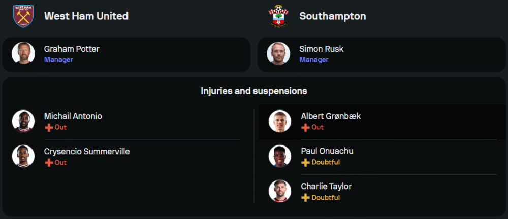 ฝั่งทีมเยือน “นักบุญ” ภายใต้การคุมทัพของ ไซม่อน รุสค์ เพิ่งโดน แอสตัน วิลล่า บุกกระหน่ำ 0-3 คาบ้าน ความพร้อมก่อนเกมนี้ จะขาดเพียง อัลเบิร์ต กรอนแบ็ค ที่บาดเจ็บยาว นอกนั้นพวกตัวเก๋ายังพร้อมลุย นำโดย คาเมร่อน อาร์เชอร์, คามัลดีน ซูเลมาน่า และ เทย์เลอร์ ฮาร์วู้ด-เบลลิส ที่จะประสานงานกันในแผน 3-4-3 เต็มรูปแบบ