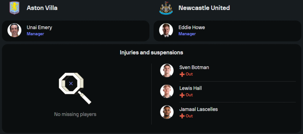 กุนซือ อูไน เอเมรี่ กำลังคึกคักสุดขีดหลังเพิ่งคว่ำ เปแอสเช แบบสุดมัน 3-2 ในศึกยุโรป ช่วงโค้งสุดท้ายแบบนี้ข่าวดีของพวกเขาคือไม่มีนักเตะตัวหลักบาดเจ็บหรือติดโทษแบนแม้แต่รายเดียว แนวรุกยังคงนำโดย โอลลี่ วัตกิ้นส์ ประสานงานกับ มอร์แกน โรเจอร์ส, มาร์โก อาเซนซิโอ้ และ มาร์คัส แรชฟอร์ด ที่กำลังระเบิดฟอร์มได้พร้อมเพรียง แดนกลางมี ยูริ ตีเลอม็องส์ ที่คุมจังหวะเกมอย่างยอดเยี่ยม
