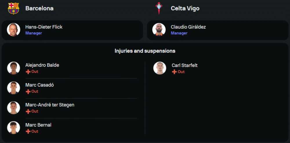 สถานการณ์ล่าสุดของเจ้าบ้านยังมีปัญหาแนวรับให้กวนใจ เพราะต้องขาด อเลฆานโดร บัลเด้, มาร์ก กาซาโด, มาร์ค อันเดร แทร์ สเตเก้น และ มาร์ก เบอร์นัล จากอาการบาดเจ็บทั้งหมด อย่างไรก็ตาม แกนหลักที่เหลืออยู่กันครบ นำโดย ลามีน ยามาล, ราฟินญ่า และ โรเบิร์ต เลวานดอฟสกี้ ที่จะช่วยกันประสานเกมรุกหวังถล่มประตูคู่แข่งให้ได้ตามเป้า