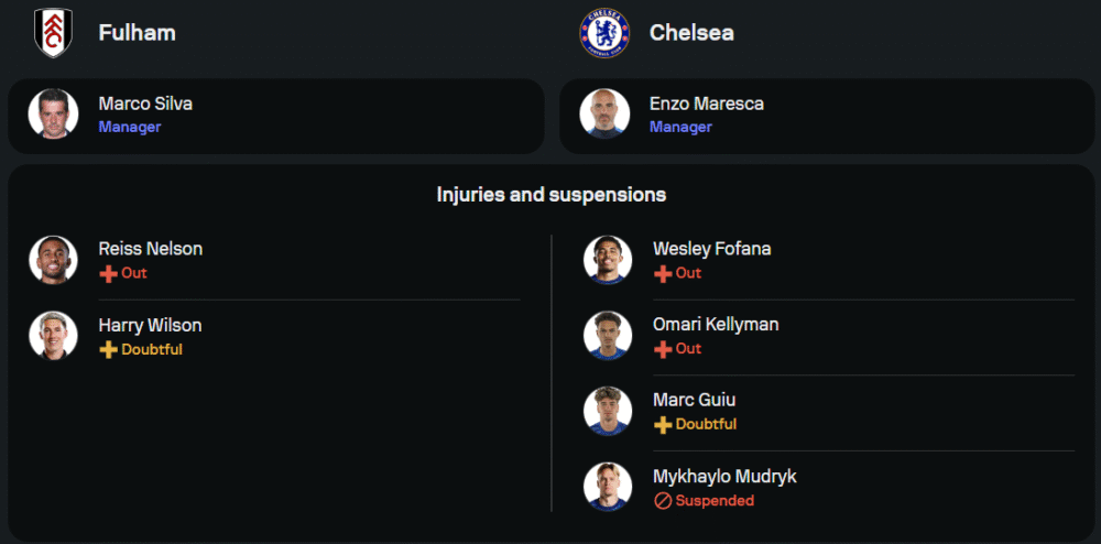 ฝั่งทีมเยือนของ เอนโซ่ มาเรสก้า ขาดตัวหลักเช่น เวสลี่ย์ โฟฟาน่า และมี มาร์ก กียู รอเช็กฟิต ส่วน มีไคโล มูดริค ติดโทษแบน ยังดีที่แนวรุกอย่าง โคล พัลเมอร์ ฟอร์มแรงต่อเนื่อง พร้อมผนึกกำลัง นิโคลัส แจ็คสัน และโนนี่ มาดูเอเก้ ล่าตาข่ายในแผน 4-2-3-1 เช่นกัน