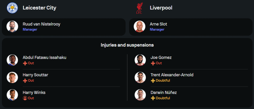ลูกทีมของ รุด ฟาน นิสเตลรอย ยังเอาตัวรอดจากโซนตกชั้นได้แบบหืดจับ หลังล่าสุดบุกเจ๊า ไบรท์ตันฯ 2-2 แบ่งแต้มมาได้ แต่ความพร้อมก่อนลงสนามคืนนี้ไม่สู้ดีนัก โดยจะขาด แฮร์รี่ วิงค์ส ที่ติดโทษแบน และ อับดุล ฟาตาวู แข้งตัวจี๊ดที่เดี้ยง คาดว่ากุนซือดัตช์จะยังใช้ระบบ 4-2-3-1 เช่นเดิม ส่ง เจมี่ วาร์ดี้ เป็นตัวจบสกอร์ โดยมี เคซี่ย์ แม็กอาเตียร์, บิลาล เอล คานนูสส์ และ สเตฟี่ มาวิดิดี้ คอยหนุนหลังสร้างเกมรุก