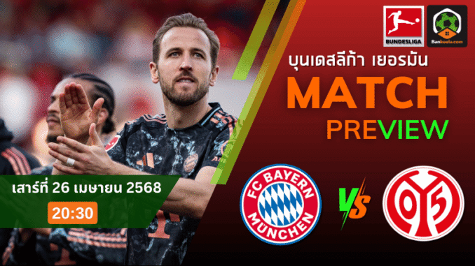 ค่ำคืนวันเสาร์ที่ 26 เมษายน 2568 เวลา 20:30 น. ตามเวลาประเทศไทย แฟนบอลเตรียมรับชมศึก บุนเดสลีกา เยอรมัน ที่ระเบิดความมันกลางสนาม อลิอันซ์ อารีน่า เมื่อ บาเยิร์น มิวนิค เปิดรังรับการมาเยือนของ เอฟเอสเฟา ไมนซ์ 05 แม้จะดูเป็นศึกที่ต่างชั้น แต่สถานการณ์บนตารางคะแนนชี้ชัดว่าไม่มีคำว่าง่ายสำหรับเกมนี้ โดยเฉพาะเมื่อ ตารางบอลวันนี้ บอกไว้ชัดว่าทั้งสองทีมต่างมีเดิมพันใหญ่ที่ต้องไล่ล่ากันต่อแบบห้ามพลาด!