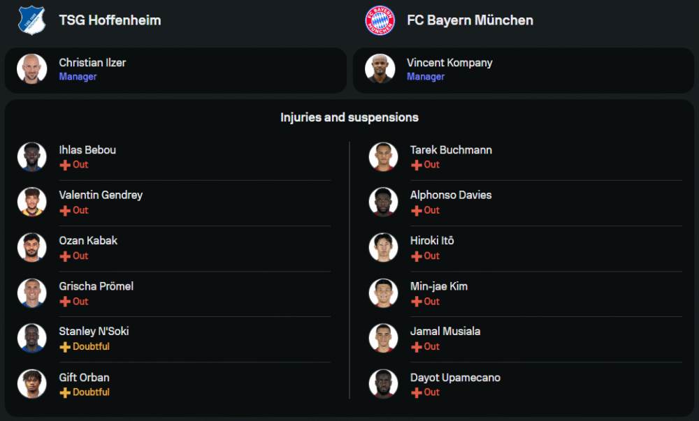 ฮอฟเฟ่นไฮม์ ของกุนซือ คริสเตียน อิลเซอร์ ต้องเจอกับสถานการณ์สุดบีบคั้น เพราะอันดับ 15 บนตาราง มีคะแนนเหนือโซนเพลย์ออฟตกชั้นแค่ 3 แต้ม ดังนั้นแมตช์นี้ไม่มีทางเลือกอื่นนอกจากต้องใส่เต็มสูบ! อย่างไรก็ตาม พวกเขาจะขาดตัวหลักหลายคน ทั้ง อิห์ลาส เบบู, วาล็องแต็ง ฌ็องเดรย์, โอซาน คาบัค, กริช่า โพรเมล ที่เจ็บหมดสิทธิ์ลงสนาม รวมถึงต้องเช็คฟิต สแตนลีย์ เอ็น’โซกี้ และ กิฟต์ ออร์บาน อีกด้วย เกมนี้จึงต้องฝากความหวังไว้กับ อดัม ฮโลเซ็ค (8 ประตู), อังเดร ครามาริช (11 ประตู) และ บาซูมาน่า ตูเร่ ในแนวรุก