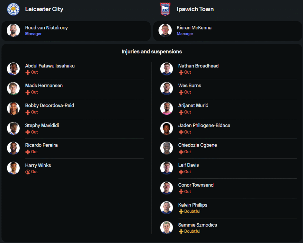 ภายใต้การคุมทัพของ รุด ฟาน นิสเตลรอย แม้เกมล่าสุดจะบุกเสมอ ฟอเรสต์ 2-2 เรียกความมั่นใจคืนมาได้บ้าง แต่ขุมกำลังยังมีปัญหาตัวเจ็บรบกวนเพียบ รายชื่อที่ต้องพักยาวอย่าง อับดุล ฟาตาวู, สเตฟี่ มาวิดิดี้, บ๊อบบี้ เด คอร์โดว่า-รี๊ด, ริคาร์โด้ เปไรร่า รวมถึงนายด่านมือหนึ่ง แม็ดส์ เฮอร์มันเซ่น ทำให้ต้องปรับแผนตลอด แนวรุกยังต้องพึ่งประสบการณ์ เจมี่ วาร์ดี้ เป็นหอกเป้า มี บิลาล เอล คานนูสส์ คอยปั้นเกมรุกหลังหัวหอก ประคองโดย วิลเฟร็ด เอ็นดิดี้ และ โอลิเวอร์ สคิปป์ คุมแดนกลาง ระบบ 4-2-3-1 กลายเป็นสูตรหลักลุยศึกนี้