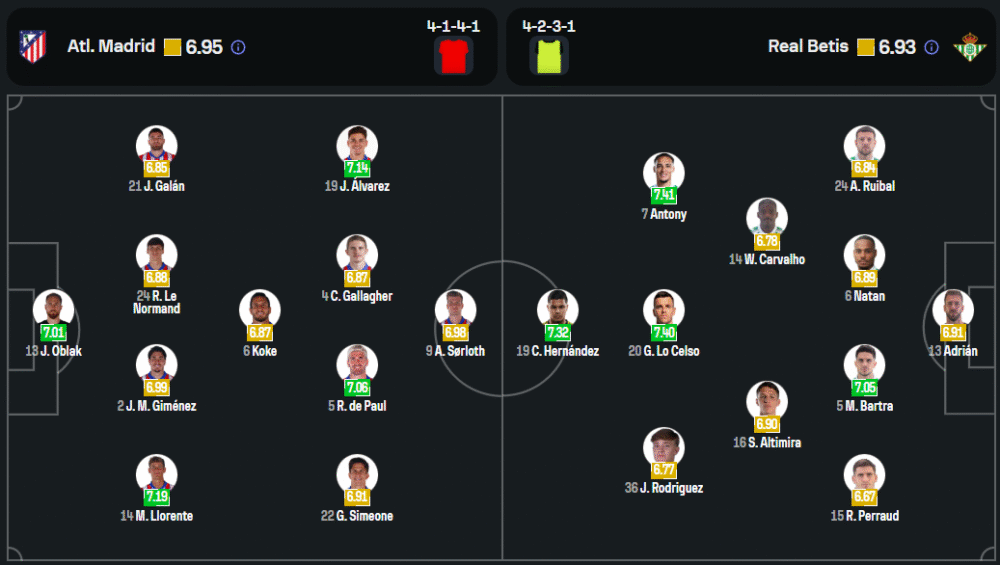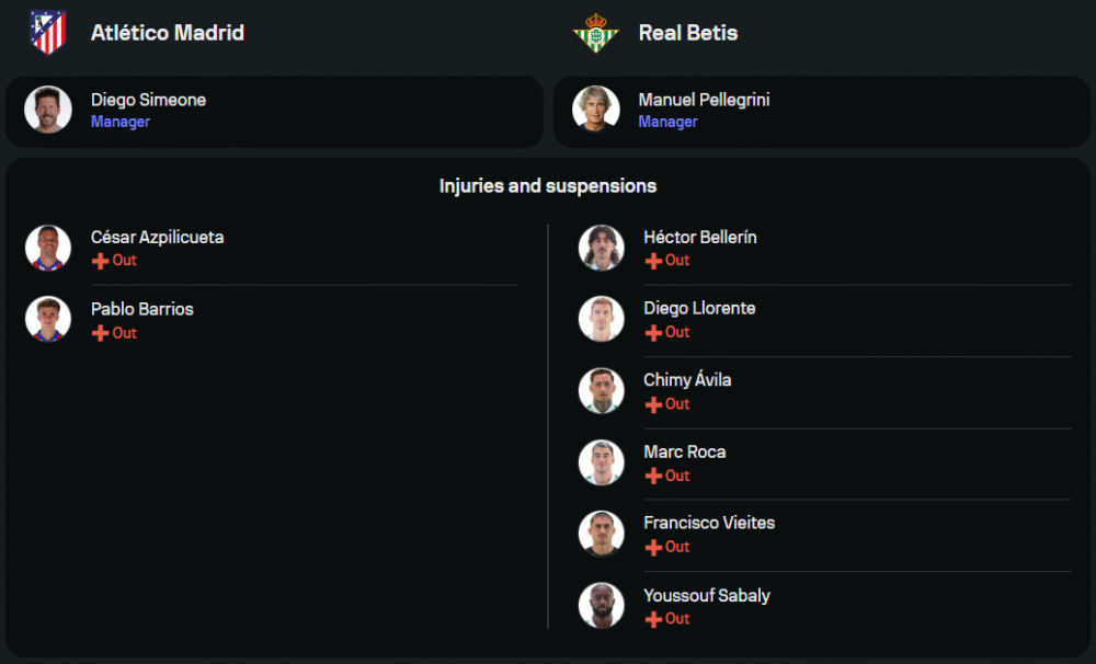 ฝั่งเจ้าถิ่นของ ดิเอโก้ ซิเมโอเน่ ไม่มีแข้งหลักบาดเจ็บเพิ่มเติมจากเกมก่อน มีแค่สองตัวเจ็บเดิมอย่าง เซซาร์ อัซปิลิกวยต้า และ ปาโบล บาร์ริออส ซึ่งไม่ส่งผลต่อภาพรวม ความสด ความดุดันพร้อมเต็มสูบ วางหมาก 4-4-2 แบบจัดหนักจัดเต็มแนวรุก อัลบาเรซ จับคู่ ซอร์ล็อธ แผงกลางวาง เดอ ปอล กับ โกเก้ บัญชาจังหวะเกม พร้อมแนวรับสายบู๊อย่าง โฆเซ่ กิมิเนซ และ เลอ นอร์ม็องด์