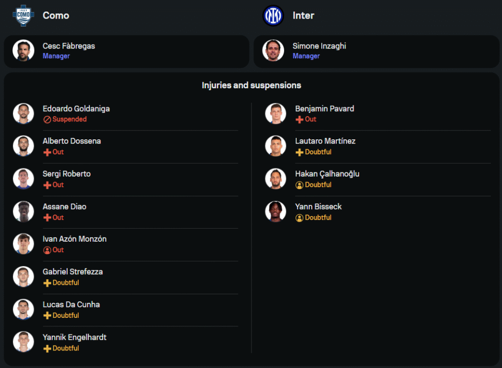ฟอร์มโค้งสุดท้ายของโคโม่เด็ดขาด! 5 นัดหลังสุดในลีก ชนะ 4 เสมอ 1 ไม่แพ้ใครเลย แนวรุกกดประตูต่อเนื่อง เกมในบ้านกดชัย 3 เกมรวด เสียเพียงแค่ลูกเดียว แถมเคยหักปีกเจนัวและปาร์ม่าได้อย่างสวยงาม สภาพทีมเต็มไปด้วยความมั่นใจสุดขีดก่อนเปิดบ้านรับอินเตอร์
