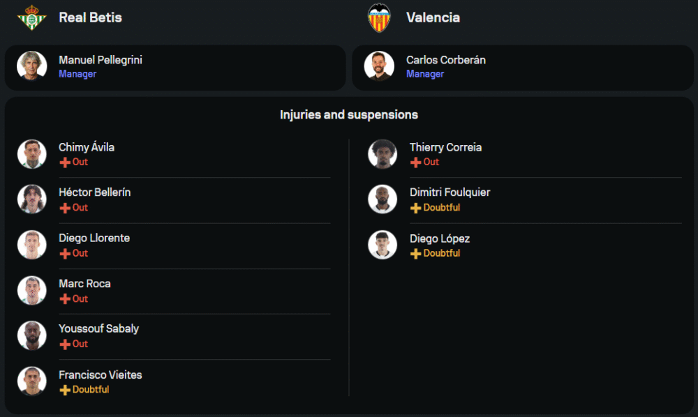 ขุนพล เรอัล เบติส ภายใต้การคุมทัพของ มานูเอล เปเญกรินี่ ไม่มีอะไรต้องลุ้นแล้วในลีก และเตรียมโรเตชั่นขุมกำลังเก็บตัวจริงไว้ลุยคอนเฟอเรนซ์ ลีก นัดชิงช่วงกลางสัปดาห์หน้า ความพร้อมเกมนี้ ตัวเจ็บยังคงเป็นหน้าเดิมทั้ง ชิมี่ อาบิล่า, เอ็คตอร์ เบเยริน, ดีเอโก้ ยอเรนเต้, มาร์ค โรก้า และยูสซูฟ ซาบาลี ส่งผลให้การจัดทัพคงเห็นดาวรุ่งอย่าง โนเอล เม็นดี้ กองหลังวัย 19 ปีได้โอกาสโชว์ของ ร่วมกับแกนสำรองทั้ง วิลเลี่ยม คาร์วัลโญ่ และ คูโช่ เอร์นานเดซ ขณะที่ จีโอวานนี่ โล เซลโซ่ รับบทเพลย์เมกเกอร์เชื่อมเกมเหมือนเดิม