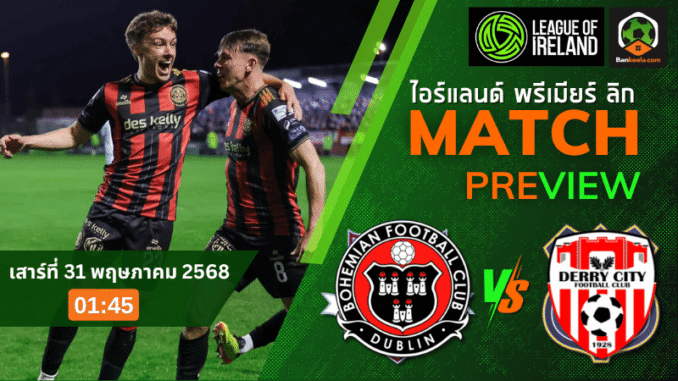 บรรยากาศปลายเดือนพฤษภาคมเดือดสะท้านลีก! ศึก พรีเมียร์ลีก ไอร์แลนด์ เดินทางมาถึงจุดที่ไม่มีใครยอมใคร คู่เอกประจำค่ำคืนวันเสาร์ที่ 31 พฤษภาคม 2568 เวลา 01:45 น. ต้องจับตาให้ดี เพราะนี่คือการพบกันของสองทีมแถวหน้าที่มีลุ้นพื้นที่ยุโรป โบฮีเมี่ยนส์ เปิดสนามรอต้อนรับ เดอร์รี่ ซิตี้ กับภารกิจชิงแต้มล้ำค่าในแมตช์นี้ ซึ่งถูกจับจองพื้นที่ใน ตารางบอลวันนี้ แบบเนียนๆ ความมันส์ระดับอารมณ์เลือดสาดจะจบลงแบบไหน ต้องห้ามพลาด!