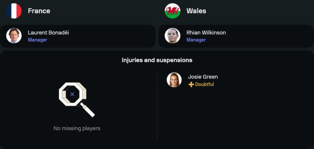 เวลส์ไม่มีปัญหาผู้เล่นบาดเจ็บเพิ่มเติมจากเกมแรกที่พ่ายเนเธอร์แลนด์ โจซี่ กรีน ยังต้องรอทดสอบความฟิต แต่ ครี ฮอลแลนด์ ที่ถูกเปลี่ยนออกเพราะตะคริวในนัดก่อนน่าจะพร้อมกลับมาลงสนาม ส่วนตัวหลักคนอื่นอย่างเจส ฟิชล็อค และแฮร์เรียต เคน ยังเป็นกำลังสำคัญในแนวรุกและแดนกลางเหมือนเดิม คาดว่าอาจปรับเล็กน้อยด้วยการส่งเอลล่า พาวเวลล์ ลงมาเสริมความสด