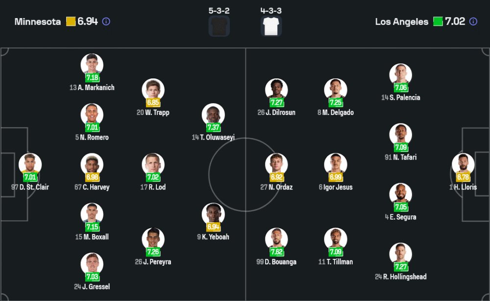 ทีมเยือนของ สตีเวน เชรูนโดโล่ จะไม่มีชื่อของ ลอเรนโซ่ เดลลาวัลเล่ ที่ยังคงต้องพักยาว และ แม็กซิม ชาโนต์ เซ็นเตอร์จอมแกร่งที่เช็คฟิตหน้างาน ทัพแอลเอยังคงมาในระบบ 4-3-3 ใช้แผงกลางคุมจังหวะด้วย อิกอร์ เชซุส ขณะที่แนวรุกจัดเต็มส่ง นาธาน ออร์ดาซ เป็นหน้าเป้า ขนาบข้างด้วย จาวาริโอ ดิลโรซุน และ เดนิส บูอองก้า ที่กำลังฟอร์มฮอต