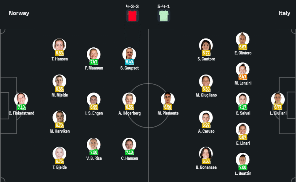 นอร์เวย์(ญ) ภายใต้การนำของกุนซือ เจมมา เกรนเจอร์ ต้องเจอปัญหาเล็กน้อยเมื่อ มาริต ลุนด์ ติดโทษแบนไม่สามารถลงช่วยทีมได้ แต่แกนหลักรายอื่นๆ อยู่ครบครัน นำโดย ฟริดา มานุม, มาร่า ฮาร์วิคเก้น และ อิซาเบล เอ็นเกน ในระบบ 4-3-3 ที่เน้นเกมรุกจัดจ้านเพื่อบุกใส่คู่แข่ง