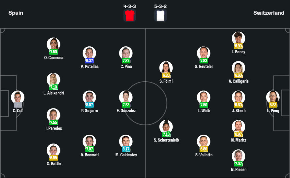 ด้านสวิตเซอร์แลนด์หญิงของกุนซือ เพีย ซุนด์ฮาเก้ แม้สภาพทีมจะฟูลทีมเช่นกัน ไม่มีตัวหลักเจ็บหรือแบน แต่ฟอร์มโดยรวมยังเป็นรองอยู่พอสมควร เกมนี้คาดว่าจะจัดทัพในแผนเน้นรับ 5-3-2 แล้วอาศัยจังหวะสวนกลับเป็นอาวุธหลัก โดยต้องฝากความหวังในการคุมจังหวะไว้กับกัปตันทีม ลีอา วอล์ติ และแนวรุกอย่าง เกราเรีย เรอูเทเลอร์ ที่เป็นคนสำคัญในการเจาะเกมรับของสเปน