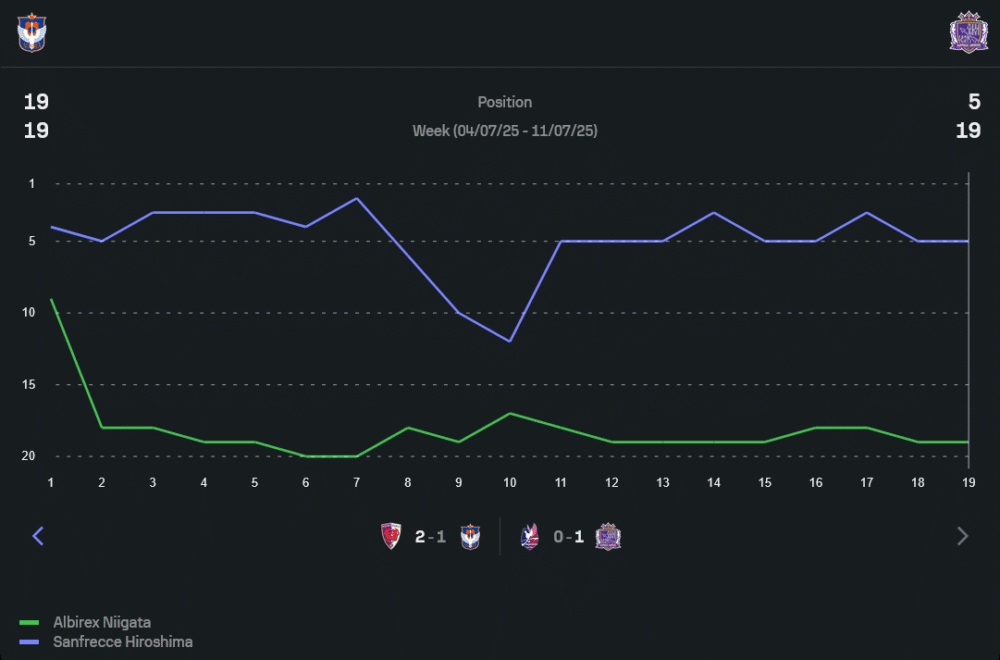 ค่ำวันอาทิตย์ที่ 20 กรกฎาคม 2568 แฟนบอลเจลีกห้ามกะพริบตา เพราะเวลา 17:00 น. ที่สนามเดงกะ บิ๊ก สวอน สเตเดี้ยม จะระเบิดศึกระหว่าง อัลบิเร็กซ์ นิงาตะ ทีมรองบ๊วย ที่กำลังดิ้นรนเอาตัวรอด เปิดบ้านรับการมาเยือนของ ซานเฟรซเซ่ ฮิโรชิม่า ทีมฟอร์มแรงอันดับ 5 ของตาราง สำหรับ ตารางบอลวันนี้ คู่นี้ถือว่ามีความหมายต่อทั้งสองทีมในแง่กำลังใจและอันดับ โดยเฉพาะทีมเจ้าถิ่นที่กำลังต้องการคะแนนเพื่อหนีตาย ส่วนราคาบอลล่าสุดเปิดมาแบบมีลุ้นพอสมควร ซานเฟรซเซ่ ฮิโรชิม่า ต่อครึ่งลูก 0.5 ท่ามกลางความกดดันที่เจ้าถิ่นหวังพลิกเกมหยุดสถิติเลวร้าย
