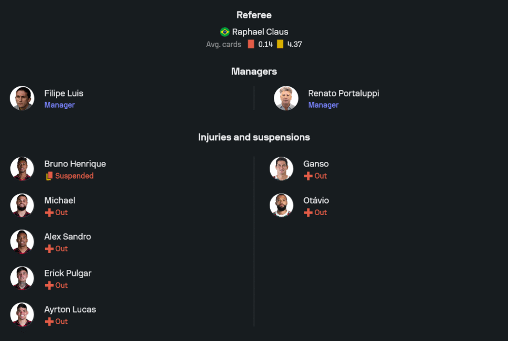 เกมล่าสุดเพิ่งบุกไปแพ้ซานโต๊สแบบพลิกล็อก แต่สภาพทีมยังถือว่าเต็มสูบ ขาดเพียง เอริค ปุลการ์ ที่บาดเจ็บกระดูกฝ่าเท้าแตก คาดว่าจะส่งแผน 4-2-3-1 โดยวางแนวรุกสามประสานอย่าง จอร์เจียน เด อาร์ราสกาเอตา, ลุยซ์ อเราโช่ และ เอแวร์ตอน ปั้นเกมอยู่ด้านหลัง กอนซาโล่ พลาต้า ในแดนหน้า เกมรับใช้แผงแบ็กโฟร์ที่มี เวสลีย์ และ ดานิโล่ ยืนเซ็นเตอร์ร่วมกับฟูลแบ็กสองฝั่งคือ วาเรล่า และ อเราโช่ อีกฝั่ง โดยมี อากุสติน รอสซี่ เฝ้าเสา