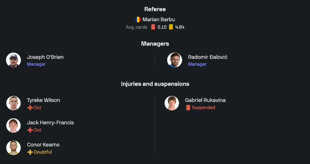 โจอี้ย์ โอเบรียน นายใหญ่ของทีมจะหมดสิทธิ์ใช้งาน ฌอน บอยด์ ดาวยิงคนสำคัญที่บาดเจ็บจากเลกแรก และยังไม่สามารถกลับมาซ้อมได้ ระบบ 4-3-3 จะยังคงถูกนำมาใช้ สามประสานแดนหน้ามี แม็ค แม็คอินรอย, แจ็ค มาร์ติน และ มิโป โอดูเบโก้ ขับเคลื่อนเกมรุก ขณะที่แดนกลางฝากความหวังไว้กับ แฮร์รี่ วู้ด, เดวิด ลุนนีย์ และ คาเมรอน นอร์ริส เพื่อเชื่อมเกมและช่วยซัพพอร์ตแนวรุก