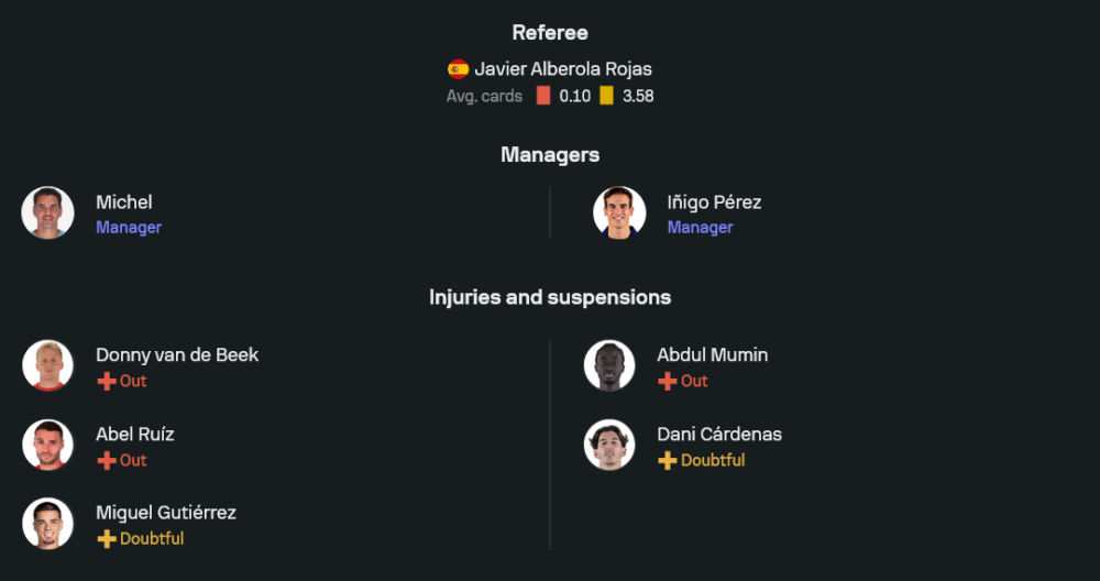 ฝั่งทีมเยือนของ อินญิโก้ เปเรซ มีปัญหาน้อยกว่า โดยผู้เล่นที่ลงสนามไม่ได้แน่คือ อับดุล มูมิน ขณะที่ ดานี่ การ์เดนาส นายด่านมือหนึ่งมีอาการไม่สมบูรณ์ แต่ ออกุสโต้ บาตาญ่า ที่เพิ่งย้ายมาร่วมทีมอย่างเป็นทางการก็พร้อมเฝ้าเสาแทน ส่วนแนวรับได้ ลุยซ์ เฟลิเป้ ลงมาคุมเกมหลังบ้านทันที เกมรุกยังคงไว้ใจคู่หอก ฆอร์เฆ เด ฟรูตอส กับ แรนดี เอ็นเตกา ขณะที่แดนกลางใช้ ออสก้าร์ บาเลนติน เป็นแกนหลักคุมจังหวะการเล่นในแผน 4-4-2 ที่พวกเขาถนัด