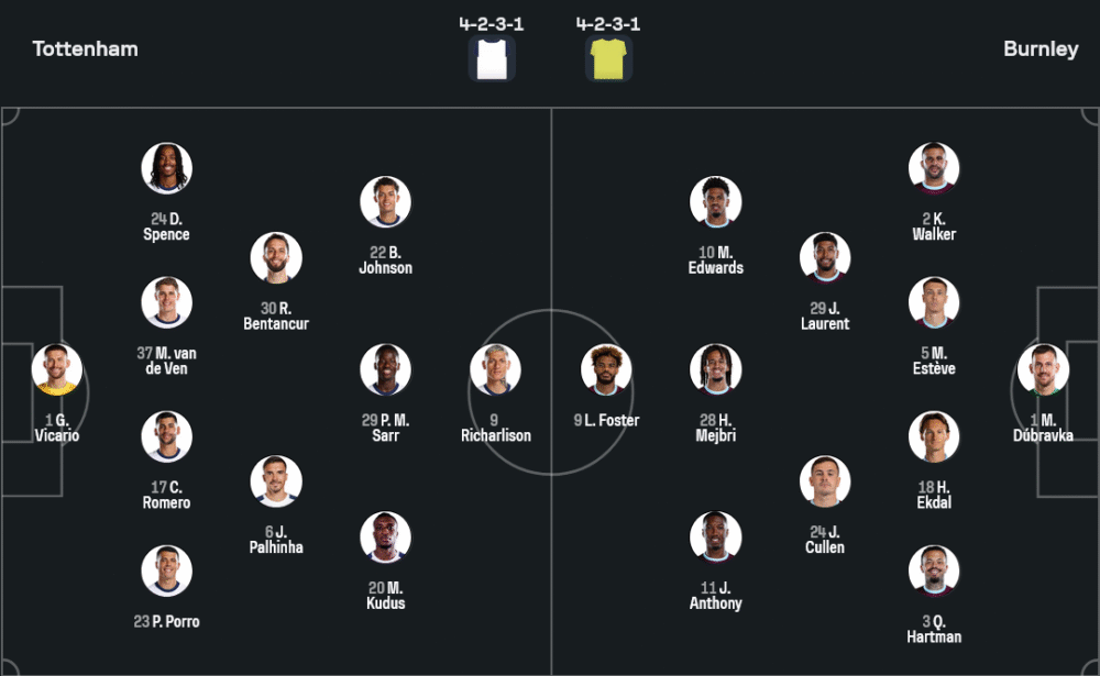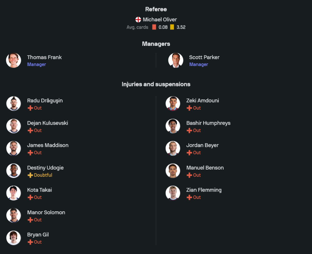 ของโธมัส แฟร้งค์ เจอปัญหาผู้เล่นบาดเจ็บยกแพ็ค ไล่ตั้งแต่ ราดู ดรากูซิน, เดยัน คูลูเซฟสกี้, เจมส์ แมดดิสัน, โคตะ ทาคาอิ, ไบรอัน กิล และ มานอร์ โซโลมอน ส่วนเดสทินี่ อูโดกี้ยังอยู่ในข่ายต้องเช็กฟิต แต่ข่าวดีคือแผงกลางและแนวรุกยังอยู่กันครบโดยมี โมฮาเหม็ด คูดุส, เบรนแนน จอห์นสัน และ ริชาร์ลิซอน เป็นสามประสานที่พร้อมลงล่าตาข่ายในระบบ 4-2-3-1
