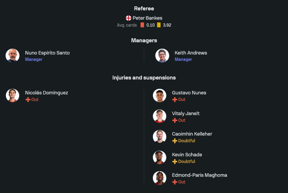 ของกุนซือ นูโน่ เอสปิริโต้ ซานโต มีปัญหาเล็กน้อยเมื่อขาด นิโกลาส โดมิงเกวซ มิดฟิลด์ตัวคุมเกมจากอาการบาดเจ็บเข่า ทำให้แผงกลางต้องขยับตัวเลือกอื่นขึ้นมารับภาระ โดยคาดว่าเกมนี้จะมาในแผน 4-2-3-1 ใช้ คริส วู้ด เป็นหน้าเป้า โดยมีสามประสานตัวรุกอย่าง แดน เอ็นดอย, มอร์แกน กิ๊บบ์ส-ไวท์ และ คัลลั่ม ฮัดสัน-โอดอย สนับสนุนอยู่ด้านหลัง ขณะที่แนวรับนำโดย มูริลโล่ และ นิโคล่า มิเลนโควิช พร้อมผู้รักษาประตูมือหนึ่งคนใหม่ มัตซ์ เซลส์ ลงเฝ้าเสา