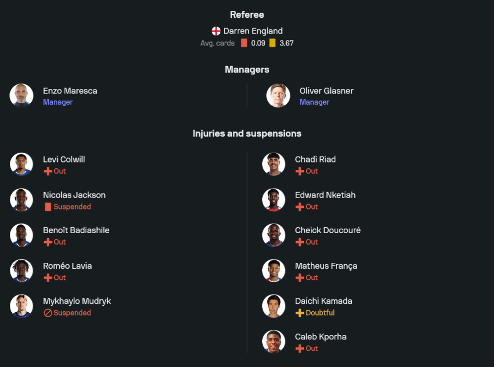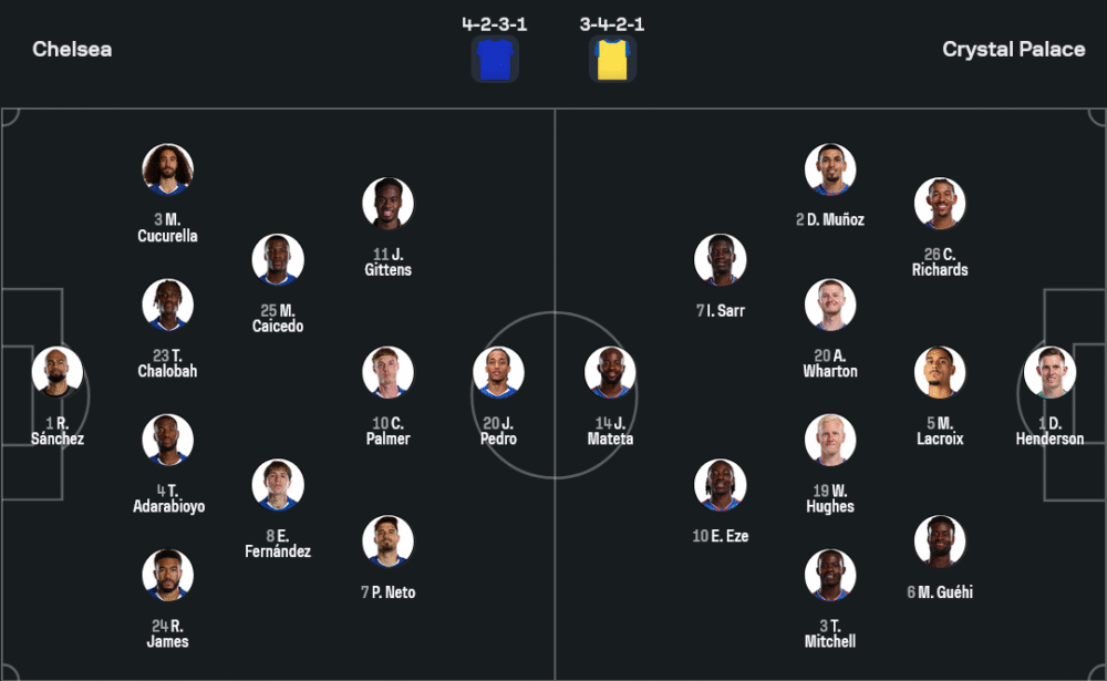 ภายใต้การคุมทัพของ เอนโซ่ มาเรสก้า เรียกได้ว่าขุมกำลังหลักพร้อมลุยเต็มสูบ แม้จะขาดตัวเจ็บอย่าง โรเมโอ ลาเวีย, เลวี่ โคลวิลล์ และ เบอนัวต์ บาเดียชิล ที่ยังพักฟื้นร่างกายอยู่ แต่ไม่มีผลกระทบมากนักต่อแผนการเล่น เกมนี้น่าจะยึดระบบ 4-2-3-1 โดยมี เชา เปโดร เป็นหน้าเป้า และมีสามประสานแนวรุกอย่าง โคล พัลเมอร์, เปโดร เนโต้ และ เจมี่ กิตเท่นส์ คอยปั่นเกมข้างหลัง แผงกลางมี มอยเซส ไกเซโด้ คุมจังหวะร่วมกับ เอ็นโซ่ เฟร์นานเดซ ส่วนแนวรับนำโดย โตซิน อดาราบิโอโย่ และ เทรโวห์ ชาโลบาห์