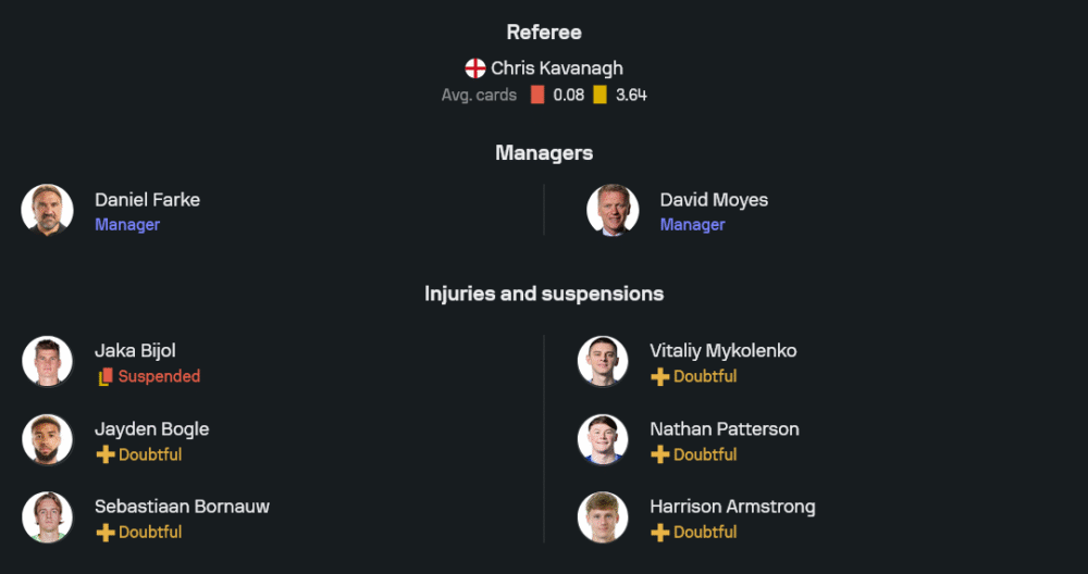 ของกุนซือ ดาเนี่ยล ฟาร์เก้ ต้องเจอปัญหาทันทีเมื่อ ยาก้า บิโยล กองหลังตัวใหม่หมดสิทธิ์ลงสนามจากโทษแบน นอกจากนี้ยังต้องลุ้นเช็กฟิตของ เจย์เดน โบเกิล และ เซบาสเตียน บอร์เนาว์ ที่ยังไม่สมบูรณ์ แต่ในภาพรวม ฟาร์เก้ยังมีตัวเลือกหลักพร้อมประจำการเต็มสูบ ระบบ 4-2-3-1 น่าจะถูกนำมาใช้โดยมี โยแอล ปิโร ยืนเป็นหัวหอกตัวเป้า และได้การสนับสนุนจากแนวรุกอย่าง แดเนี่ยล เจมส์, เบรนเดน อารอนสัน และ วิลฟรีด ญอนโต้ ส่วนแดนกลางคุมเกมโดย สีน ลองสตาฟฟ์ และ อันตอน สตัค