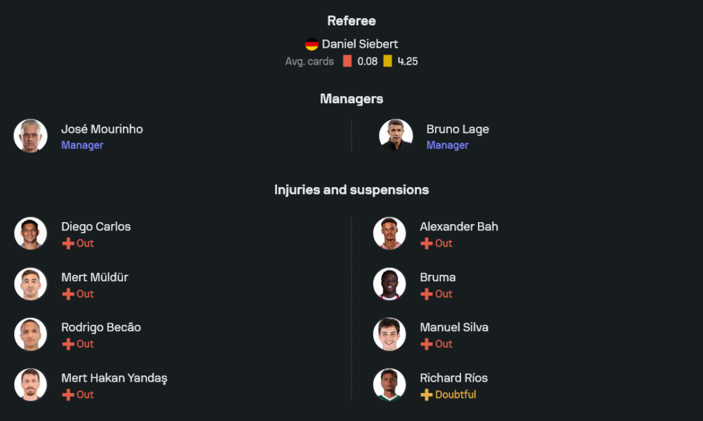 โชเซ่ มูรินโญ่ เตรียมขนขุมกำลังหลักลงเต็มพิกัด แม้จะขาดตัวเจ็บหน้าเดิมอย่าง ดิเอโก้ คาร์ลอส, เมิร์ต มุลดูร์, โรดริโก เบเกา และ เมิร์ต ฮาคาน ยานดาส แต่ตัวจริงที่เหลือพร้อมรบเต็มระบบ โดยใช้แผน 3-4-1-2 แดนกลางมี เฟร็ด คุมเกมร่วมกับ โซฟียาน อัมราบัต และแนวรุกฝากความหวังที่คู่หอก ยูสเซฟ เอ็น-เนสซีรี และ จอห์น ดูรัน