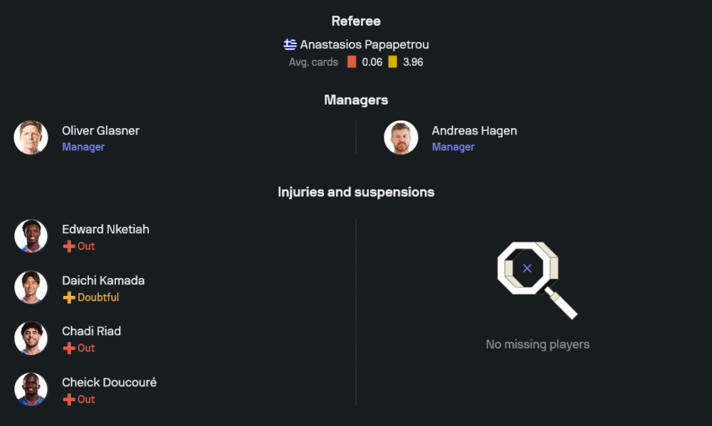 ลูกทีมของ โอลิเวอร์ กลาสเนอร์ เจอปัญหาตัวเจ็บพอสมควร เมื่อจะไม่มีทั้ง เอ็ดเวิร์ด เอ็นเคเทียห์, ชี๊ค ดูกูเร่, ชาดี้ ริอัด รวมถึง มาเธอุส ฟรังช่า ที่ยังเดี้ยงยาว แถมยังต้องรอลุ้นความฟิตของ ไดชิ คามาดะ ที่สภาพร่างกายไม่เต็มร้อย อย่างไรก็ตาม กุนซือชาวออสเตรียยังมั่นใจจัดทัพ 3-4-2-1 โดยใช้ ฌ็อง-ฟิลิปป์ มาเตต้า ยืนหอกเดี่ยว มี เจซูรุน รัค-ซาคยี และ โรเมน เอสเซ่ เป็นคู่ตัวรุกด้านหลัง ส่วนแดนกลางมี เจฟเฟอร์สัน เลอร์มา และ อดัม วอร์ทัน เป็นแกนคุมเกม