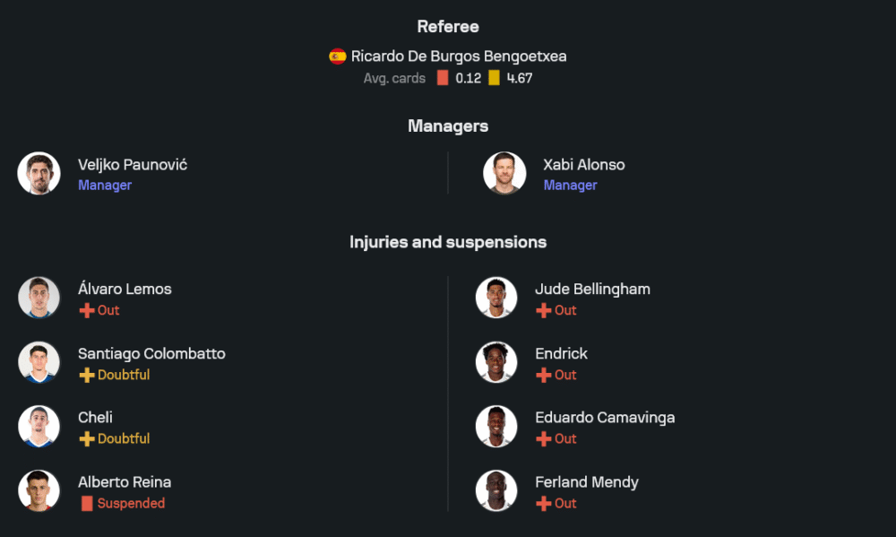 ด้านทีมเยือนของ ชาบี อลอนโซ่ เจอปัญหาขุมกำลังไม่น้อยเช่นกัน เพราะไม่มีชื่อของ จู๊ด เบลลิ่งแฮม เพลย์เมกเกอร์คนสำคัญที่เจ็บยาว รวมถึง เอ็นดริก ดาวรุ่งตัวความหวังที่ยังไม่พร้อม เช่นเดียวกับ เอดูอาร์โด้ คามาวิงก้า และ แฟร์กล็อง เมนดี้ ที่เดี้ยงอยู่ แต่ยังดีที่ขุมกำลังหลักอย่าง คิเลียน เอ็มบัปเป้, วินิซิอุส จูเนียร์ และ เฟเดริโก้ บัลเบร์เด้ ฟิตสมบูรณ์พร้อมลงสนาม โดยจะจัดทัพในระบบ 4-3-3 มี เอ็มบัปเป้ ยืนเป็นหอกตัวเป้า พร้อมป่วนเกมรับเจ้าถิ่นเต็มที่
