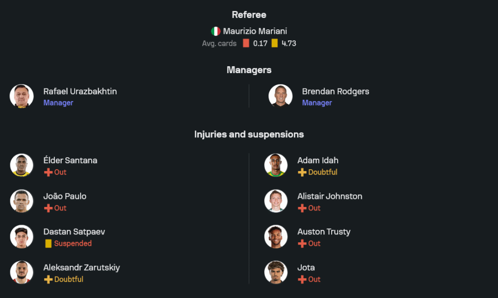 เจ้าถิ่นมีปัญหาในแนวรุกพอสมควร เมื่อยังไม่มีชื่อของ เจา เปาโล และ เอลแดร์ ซานตาน่า ที่เจ็บยาว ขณะที่ ดัสตาน ซาตปาเยฟ ต้องชดใช้โทษแบน ส่วน อเล็กซานเดอร์ ซารุตสกีย์ มีอาการบาดเจ็บรบกวนและต้องรอเช็กความฟิต อย่างไรก็ตาม ตัวหลักอย่าง แดน เกลเซอร์, ริคาร์ดินโญ่ และ เอดมิลสัน ยังคงพร้อมลงสนามเพื่อสร้างความแตกต่าง