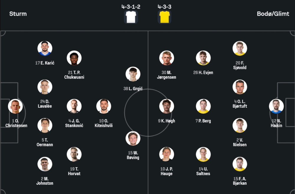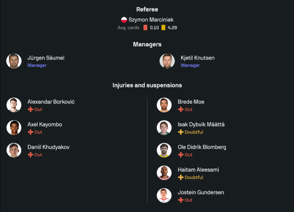 ทีมเยือนก็ไม่ได้สมบูรณ์เต็มร้อยเช่นกันเมื่อมีผู้เล่นเจ็บหลายราย ทั้ง เบรเด โม, โยสไตน์ กุนเดอร์เซ่น, โอเล ดิดริก บลอมเบิร์ก และยังต้องเช็กฟิตของ อีซัค ดีบวิก แมตต้า รวมถึง ไฮตาม อาลีซามี่ อย่างไรก็ตาม ขุมกำลังตัวหลักยังพร้อมเต็มที่ในระบบ 4-3-3 นำโดย เยนส์ เพตเทอร์ เฮาเก้, แคสเปอร์ โฮฟ และ มาธิอัส เจอร์เกนเซ่น ที่พร้อมสร้างปัญหาให้แนวรับเจ้าถิ่น