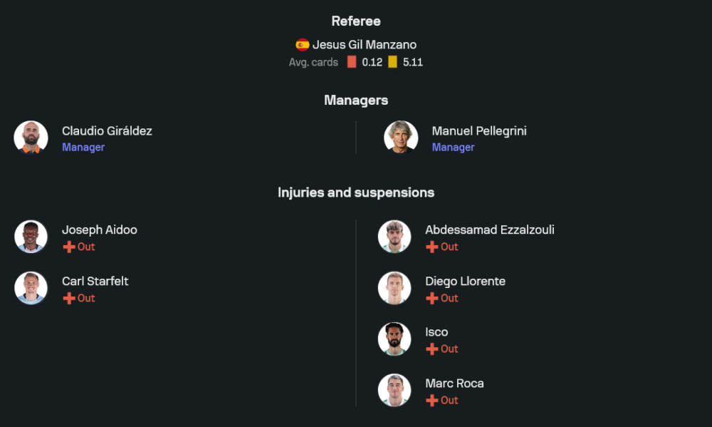 ทีมเยือนของกุนซือ มานูเอล เปเยกรินี่ มีปัญหาหนักกว่าเจ้าถิ่น เพราะจะขาดแข้งตัวหลักหลายราย ทั้ง อิสโก้, ดิเอโก้ ยอเรนเต้, อับเดสซามัด เอซซัลซูลี่ และ มาร์ก โรกา ที่เจ็บทั้งหมด ส่งผลต่อแดนกลางพอสมควร อย่างไรก็ตามยังมีดาวเตะฝีเท้าคมอย่าง โจวานี่ โล เซลโซ่ คอยบัญชาเกมรุก ขณะที่หน้าเป้าใช้ เซดริก บากัมบู ยืนล่าตาข่ายในระบบ 4-2-3-1