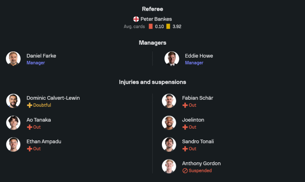 เอ็ดดี้ ฮาว เจอปัญหาเช่นกันเมื่อขาดนักเตะตัวหลักเพียบ ทั้ง ฟาเบียน แชร์, โชเอลินตอน, ซานโดร โตนาลี่ ที่บาดเจ็บ และ แอนโธนี่ กอร์ดอน ที่ติดโทษแบน แต่แนวรุกยังมีทีเด็ดส่ง ฮาร์วี่ย์ บาร์นส์, วิลเลี่ยม โอซูล่า และ แอนโธนี่ อีลังก้า ลงล่าตาข่าย โดยมี บรูโน่ กีมาไรส์ คุมจังหวะในแดนกลาง เกมรับต้องฝากความหวังไว้ที่ คีแรน ทริปเปียร์ และ นิค โป๊ป ผู้รักษาประตูมือหนึ่ง