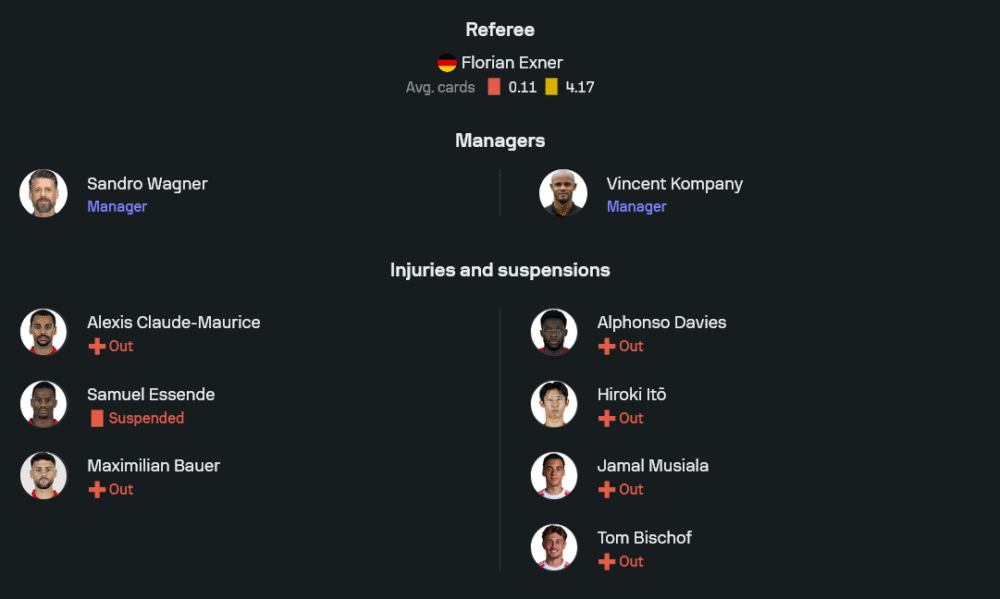 วินเซนต์ กอมปานี กุนซือเสือใต้ ต้องขาดแข้งตัวหลักหลายราย ไม่ว่าจะเป็น อัลฟอนโซ่ เดวี่ส์, ฮิโรกิ อิโตะ, ยามาล มูเซียล่า และ ทอม บิสชอฟ ที่ยังเจ็บทั้งหมด แต่ด้วยขุมกำลังที่แน่นและลึกทำให้ไม่กระทบมากนัก แนวรุกยังคงจัดเต็มนำโดย แฮร์รี่ เคน ที่กำลังร้อนแรง ยิงกระจายตั้งแต่เปิดฤดูกาล สนับสนุนด้วย ไมเคิ่ล โอลิเซ่, หลุยส์ ดิอ๊าซ และ เซิร์จ นาบรี้ แดนกลางมี โยชัว คิมมิค และ เลออน โกเร็ตซ์ก้า คุมเกม ส่วนแนวรับวางใจ อูปาเมกาโน่ ยืนคู่ โยนาธาน ตาห์ โดยมี มานูเอล นอยเออร์ เฝ้าเสา